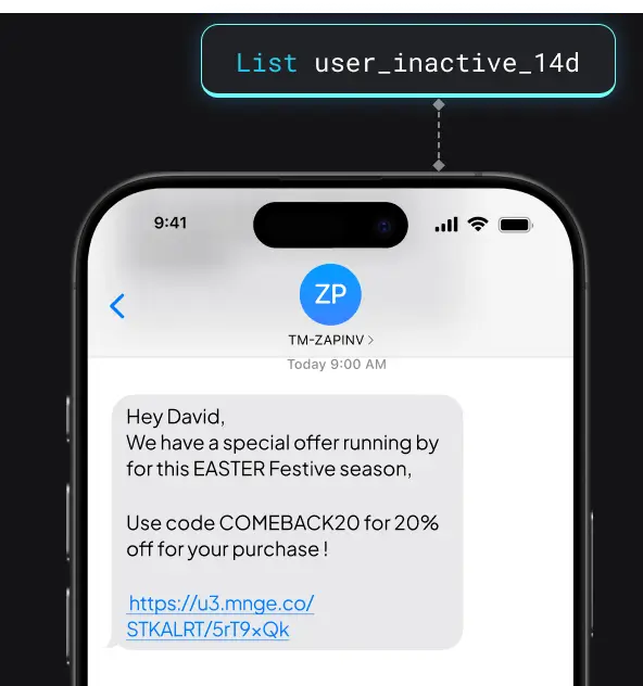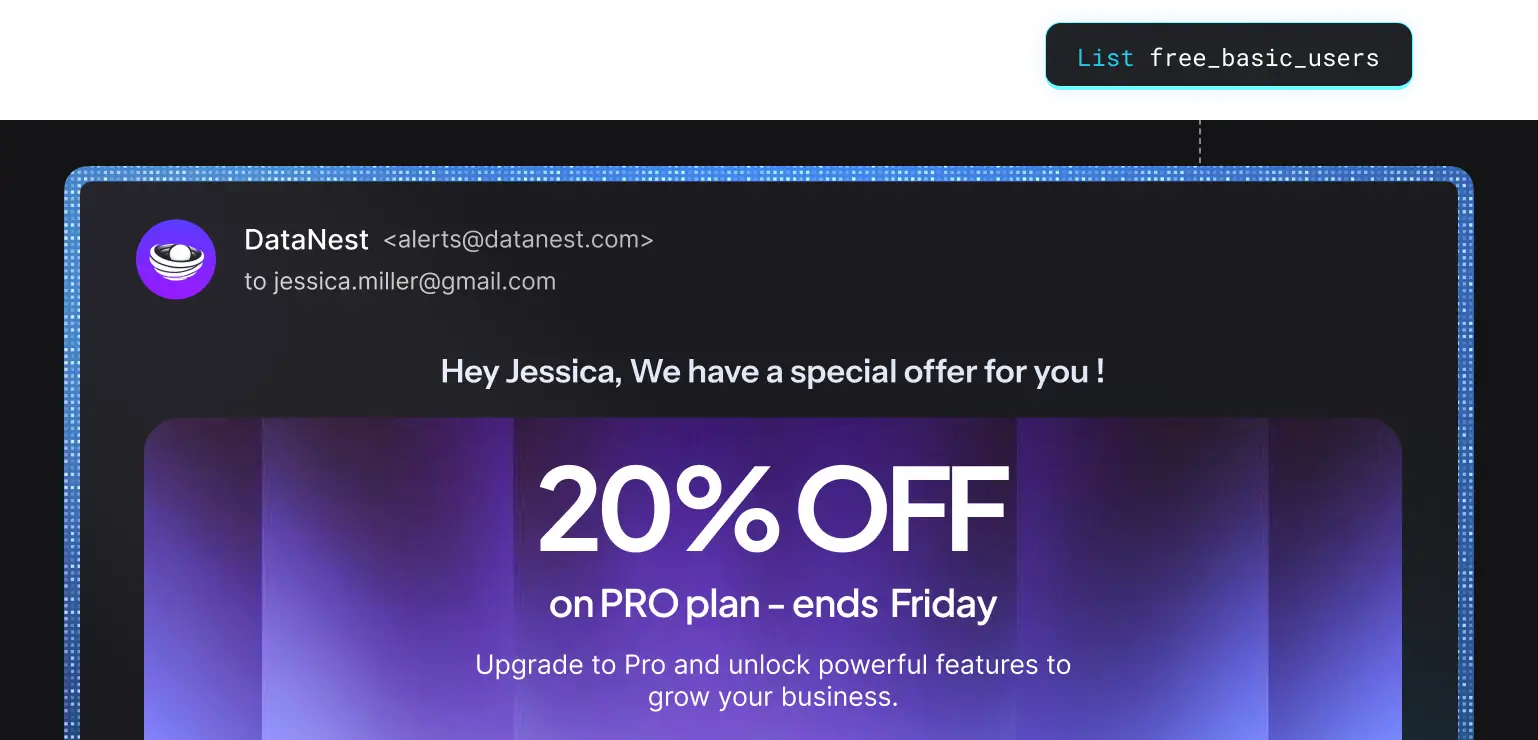Write SQL against your cloud warehouse. Dynamic Lists stay current with full customer context — no pipelines to maintain.