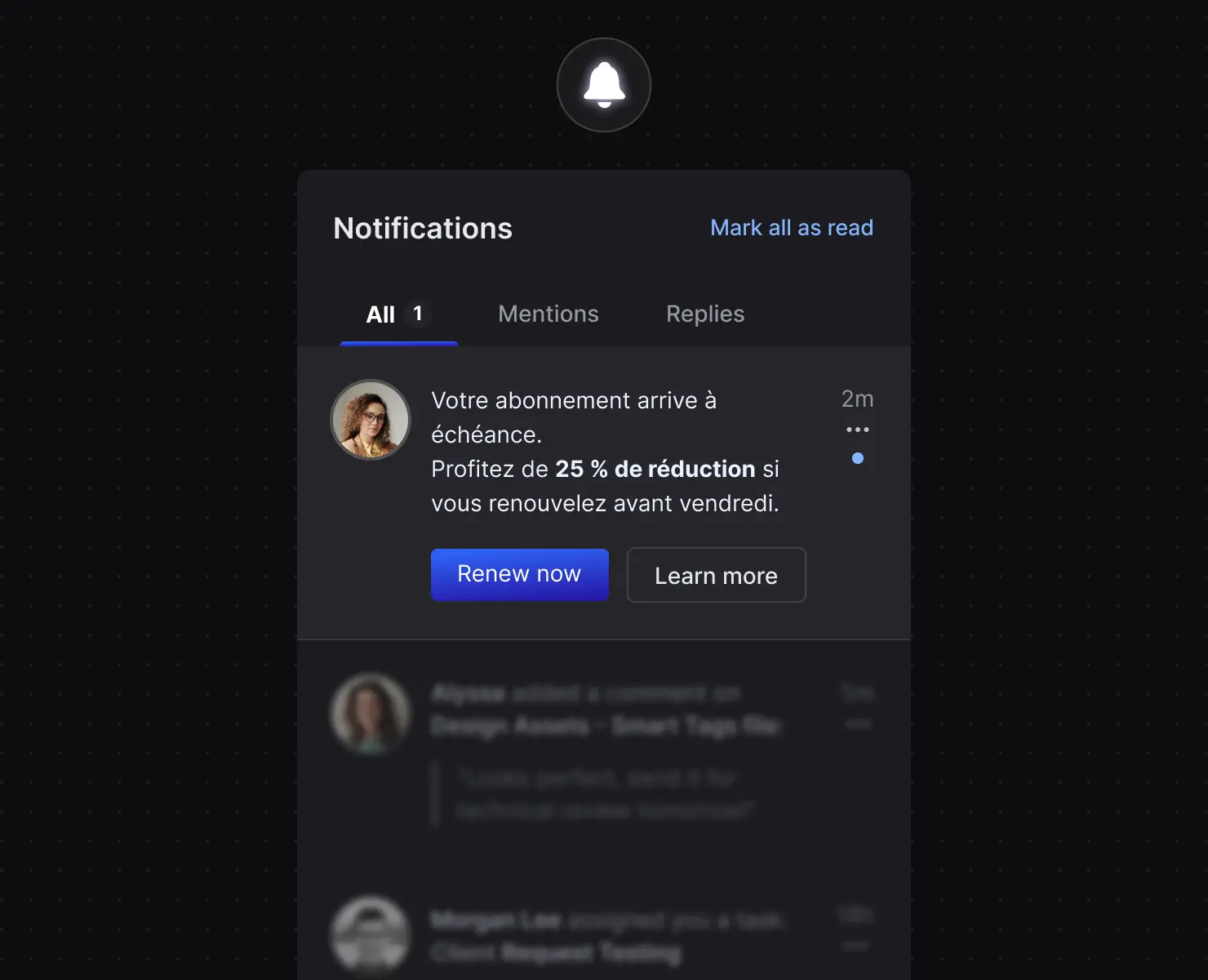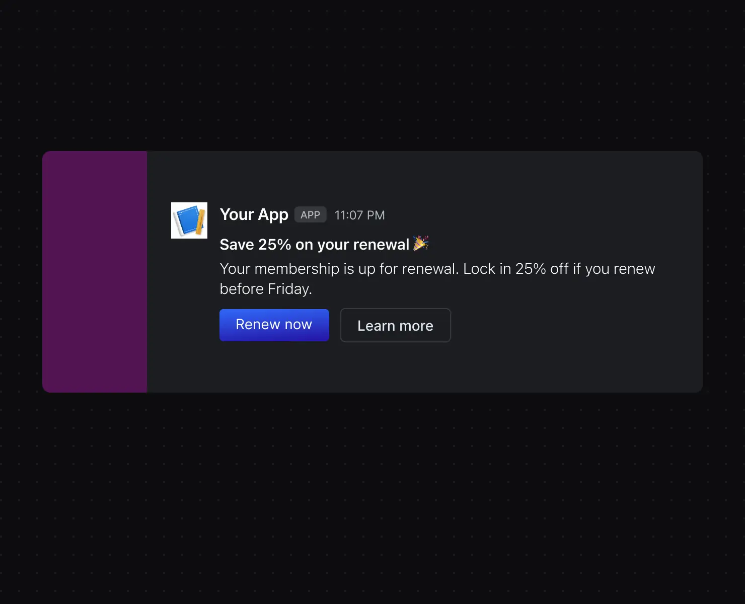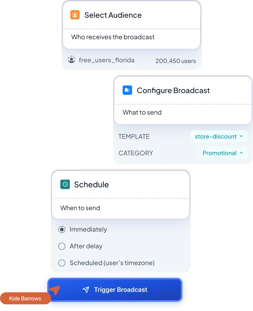 Run one-time or scheduled campaigns across email, SMS, push, chat, and in-app — from one place.