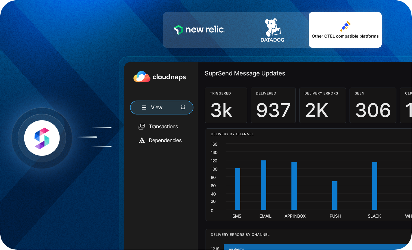SuprSend now streams notification metrics via OpenTelemetry Protocol (OTLP) in near real-time, with latency under one minute. Connect it to Datadog, Grafana, Honeycomb, or any OTEL-compatible observability platform.