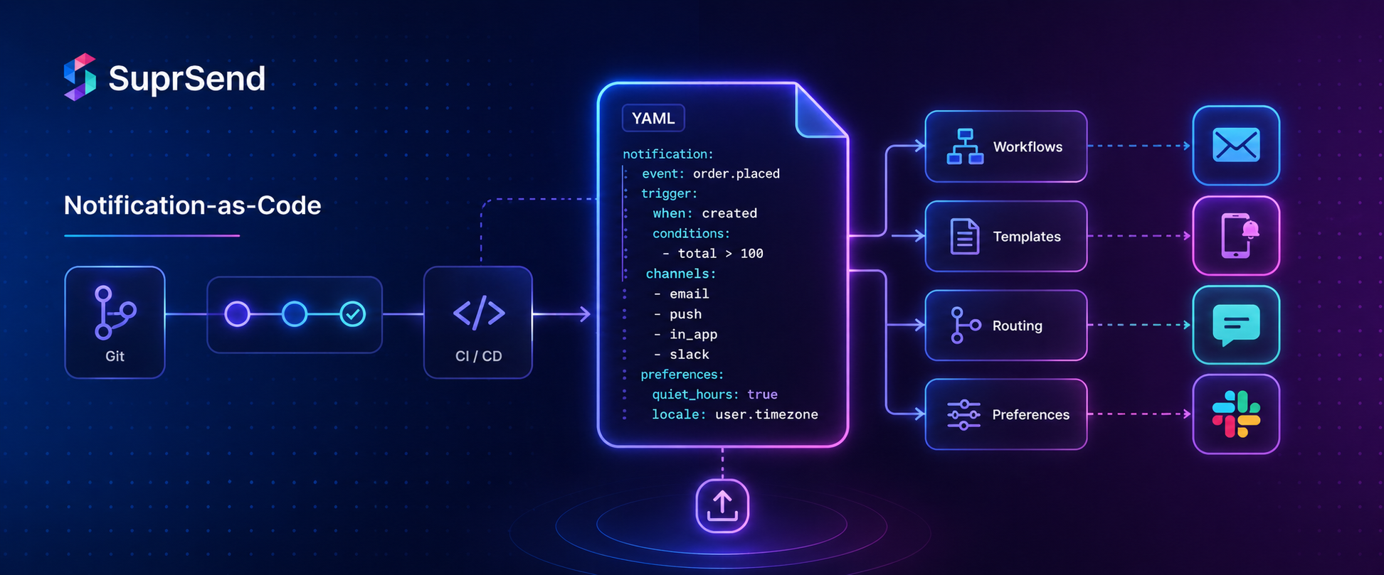 SuprSend supports notification-as-code through its CLI and API. Teams can define notification templates, workflows, and routing rules in YAML configuration files, manage them in Git, and sync them with the SuprSend platform using the CLI.
