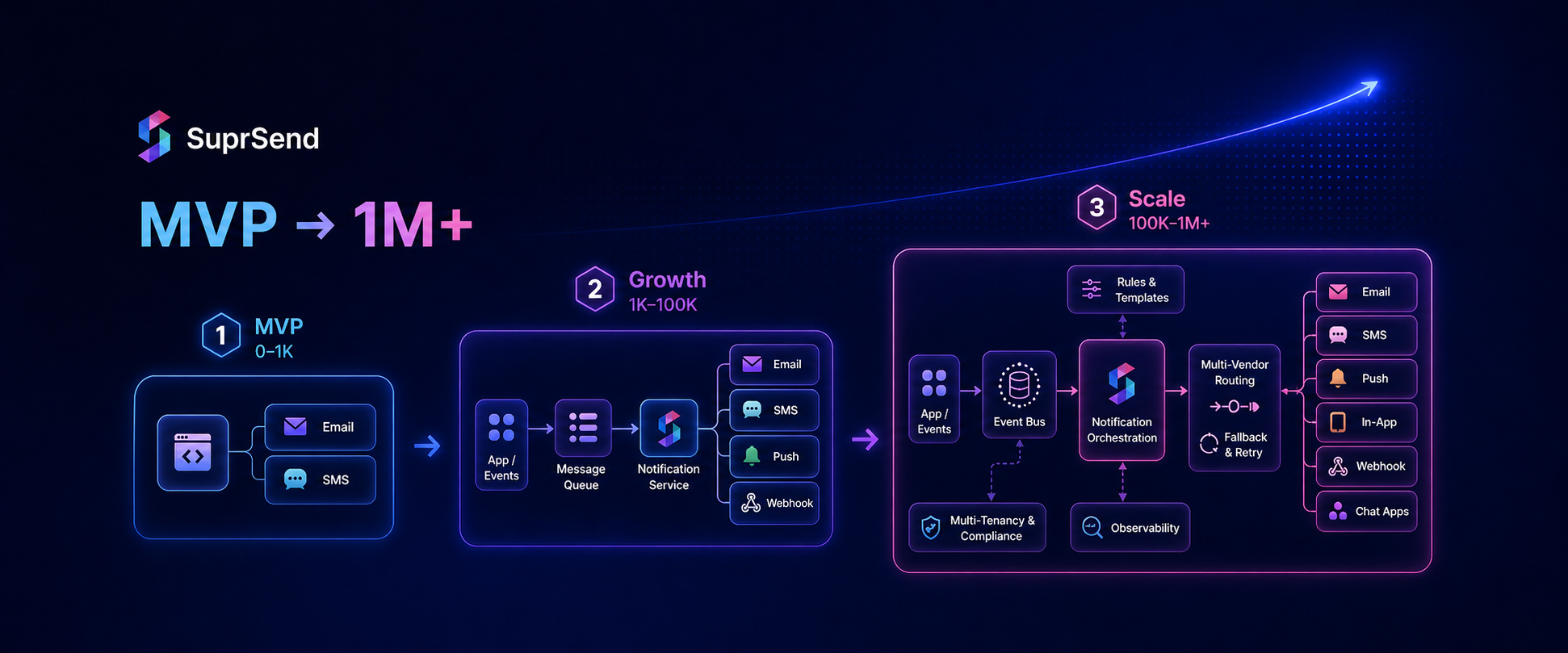 This guide walks through how notification system architecture should evolve across three stages of SaaS growth: MVP (0-1K users), Growth (1K-100K users), and Scale (100K-1M+ users). Each stage introduces new architectural requirements, failure modes, and design decisions.