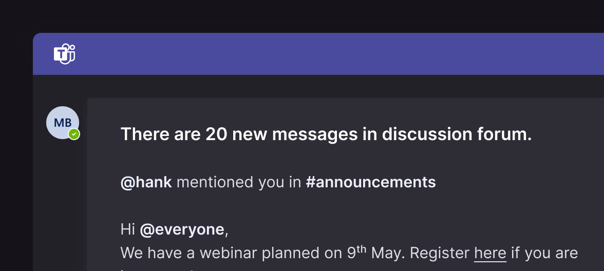 Combine multiple alerts into one well-designed notification across all channels. Control how often it’s sent—hourly, daily, or based on user preferences.